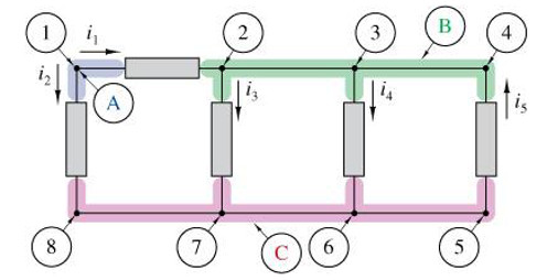 \[\text{Node A: } -i_1 - i_2 = 0\] \[\text{Node B: } i_1 - i_3 - i_4 + i_5= 0\] \[\text{Node C: } i_2 + i_3 + i_4 - i_5= 0\]